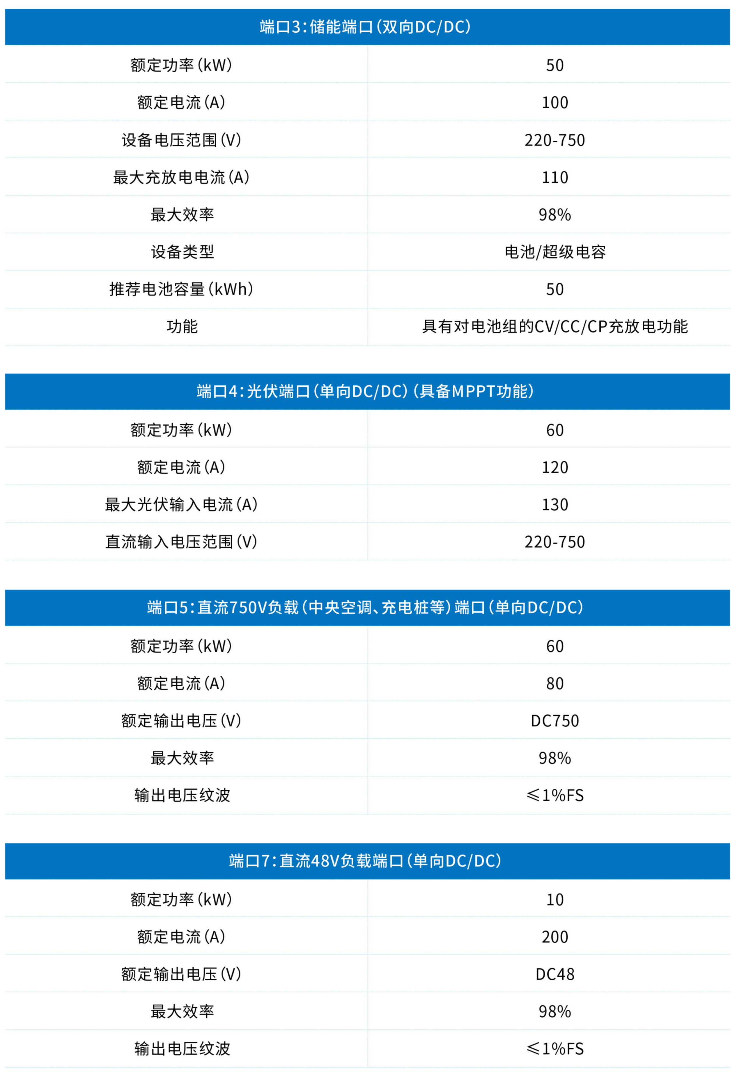 本公司生產(chǎn)的標(biāo)準(zhǔn)多端口電能路由器包含七個端口,其中兩個交流端口接市電或交流負(fù)載;五個直流端口分別接入儲能、光伏和三種電壓的直流負(fù)載,每個端口均可接入相應(yīng)電壓等級的有源或無源設(shè)備,任意端口間可以實現(xiàn)功率潮流的控制。